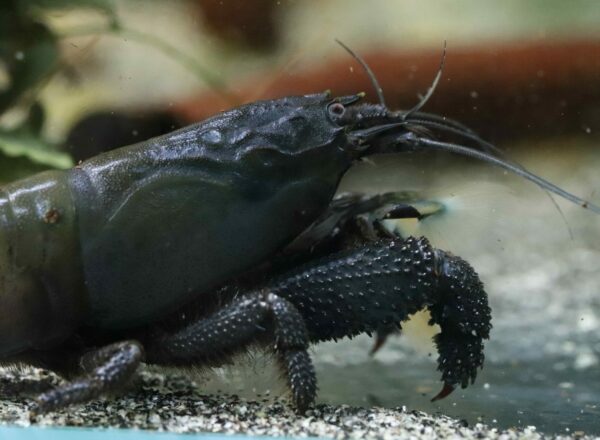 Atya gabonensis, la crevette bleue du Gabon, possède une carapace d’un bleu gris rose, mais lors de chaque mue, elle devient toute blanche avec des pattes postérieures très importantes mais sans pince.