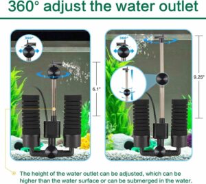 • La sortie d’eau peut être réglée et étirée à 360 ° : le tuyau de sortie rétractable peut être allongé et tourné, il est pratique de régler la hauteur de la sortie d’air, de changer la direction et la hauteur du débit d’eau pour répondre à vos besoins. La filtration ne peut pas seulement purifier la qualité de l’eau et augmenter la circulation de l’eau, mais aussi augmenter la teneur en oxygène dans l’eau.