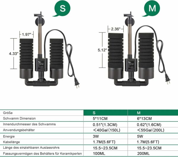 • Deux Tailles disponibles : Taille S: pour aquarium de 30 à 75 litres (Taille conseillé 30-60 litres) / Taille M: pour aquarium de 50 à 150 litres (Taille conseillé 50-120 litres).
