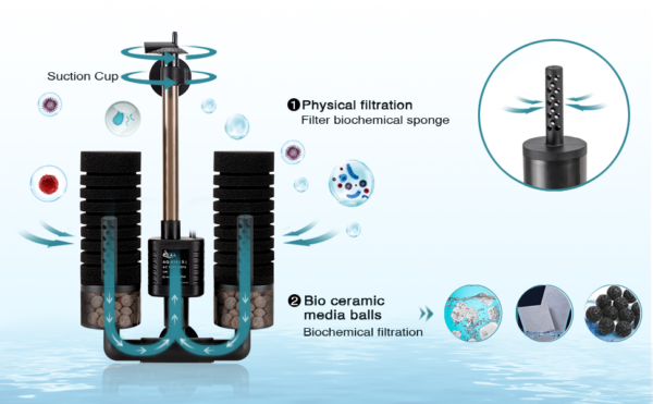 • Filtration physique et filtration biochimique : avec le design en éponge à 9 couches en forme de nervure, vous pouvez combiner à la fois la filtration mécanique et biologique, la biofiltration, l’oxygénation et la filtration physique. L’éponge peut absorber les particules fines pour obtenir l’effet de purification de l’eau. Les billes biocéramiques améliorent l’effet filtrant et peuvent nettoyer rapidement la qualité de l’eau.