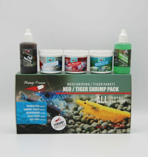 Avec la boîte Shrimps Forever Neocaridina/tiger, vous disposez de tout le nécessaire pour l’élevage et la conservation des crevettes Neocaridina/tiger. Cette boîte contient différents types d’aliments, minéraux et additifs. Ce paquet contient :