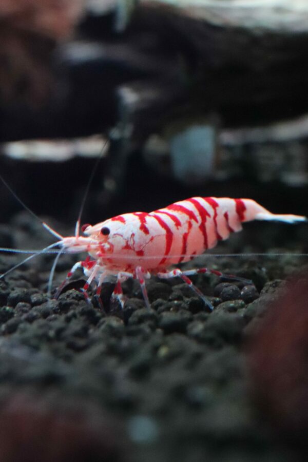 Les crevettes Fancy Tiger sont un hybride entre une crevette tigre et une crevette cristal. Elles héritent normalement de la couleur du parent cristal avec une magnifique éclaboussure de rayures et de formes couvrant leurs corps. Cette morphologie ne se trouve qu’en captivité et a été élevée sélectivement. Une Fancy Tiger Rouge proviendra d’un parent Cristal Rouge, et une Fancy Tiger Noire d’un parent Cristal Noir. Un adulte peut atteindre environ 3 cm de taille.